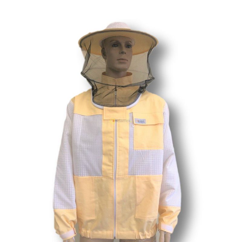 Bluza pszczelarska z kapeluszem i wentylacją, zapinana na suwak. Kołnierz typu stójka, kapelusz z możliwością odpięcia.