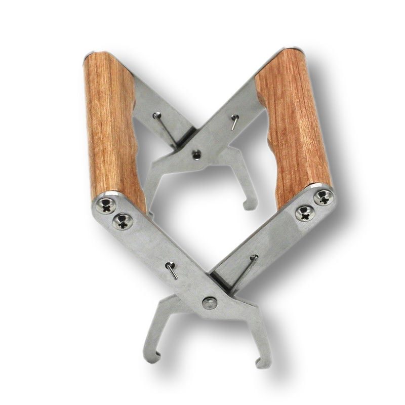 Metalowy chwytak do ramek z drewnianą rączką.